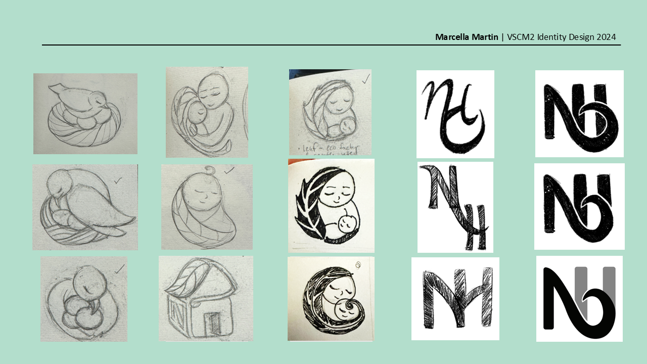 This logo was developed through explorations of nature, nurture, and connection. While the original logo felt too complex, I wanted to capture its essence in a simpler, more cohesive form. The leaf reflects the brand’s connection to nature and sustainability, while its enclosing shape forms a home that symbolizes care, comfort, and the bond between parent and child.